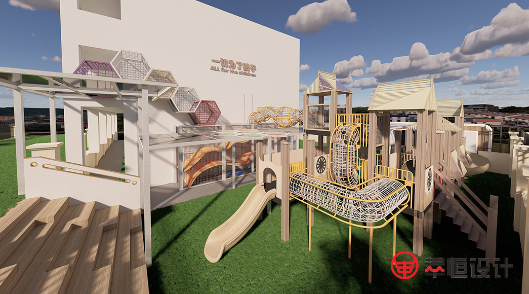 设计师运用六边形爬笼将大型玩具与室内相连接,玩具与玩具之间相连接,打造灵活的使用空间,增加儿童的乐趣性!