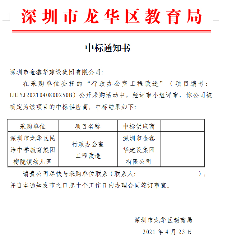 在采购单位委托的“行政办公室工程改造”公开采购活动中,我公司被确定为该项目的中标供应商。